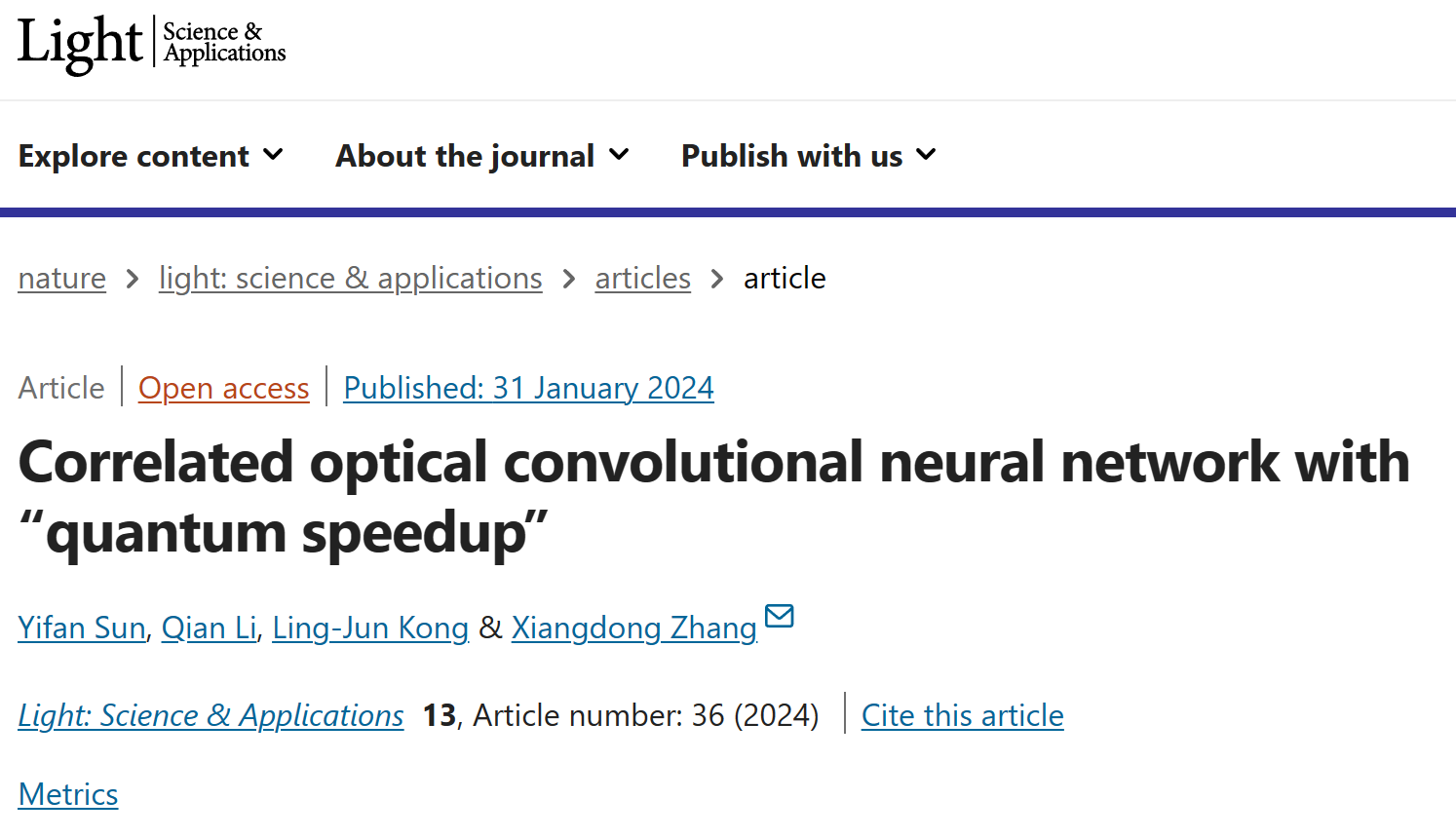 Compared with electrical neural networks, optical neural networks (ONNs) have the potentials to break the limit of the bandwidth and reduce the consumption of energy, and therefore draw much attention in recent years. By far, several types of ONNs have been implemented. However, the current ONNs cannot realize the acceleration as powerful as that indicated by the models like quantum neural networks. How to construct and realize an ONN with the quantum speedup is a huge challenge. Here, we propose theoretically and demonstrate experimentally a new type of optical convolutional neural network by introducing the optical correlation. It is called the correlated optical convolutional neural network (COCNN). We show that the COCNN can exhibit “quantum speedup” in the training process. The character is verified from the two aspects. One is the direct illustration of the faster convergence by comparing the loss function curves of the COCNN with that of the traditional convolutional neural network (CNN). Such a result is compatible with the training performance of the recently proposed quantum convolutional neural network (QCNN). The other is the demonstration of the COCNN’s capability to perform the QCNN phase recognition circuit, validating the connection between the COCNN and the QCNN. Furthermore, we take the COCNN analog to the 3-qubit QCNN phase recognition circuit as an example and perform an experiment to show the soundness and the feasibility of it. The results perfectly match the theoretical calculations. Our proposal opens up a new avenue for realizing the ONNs with the quantum speedup, which will benefit the information processing in the era of big data.