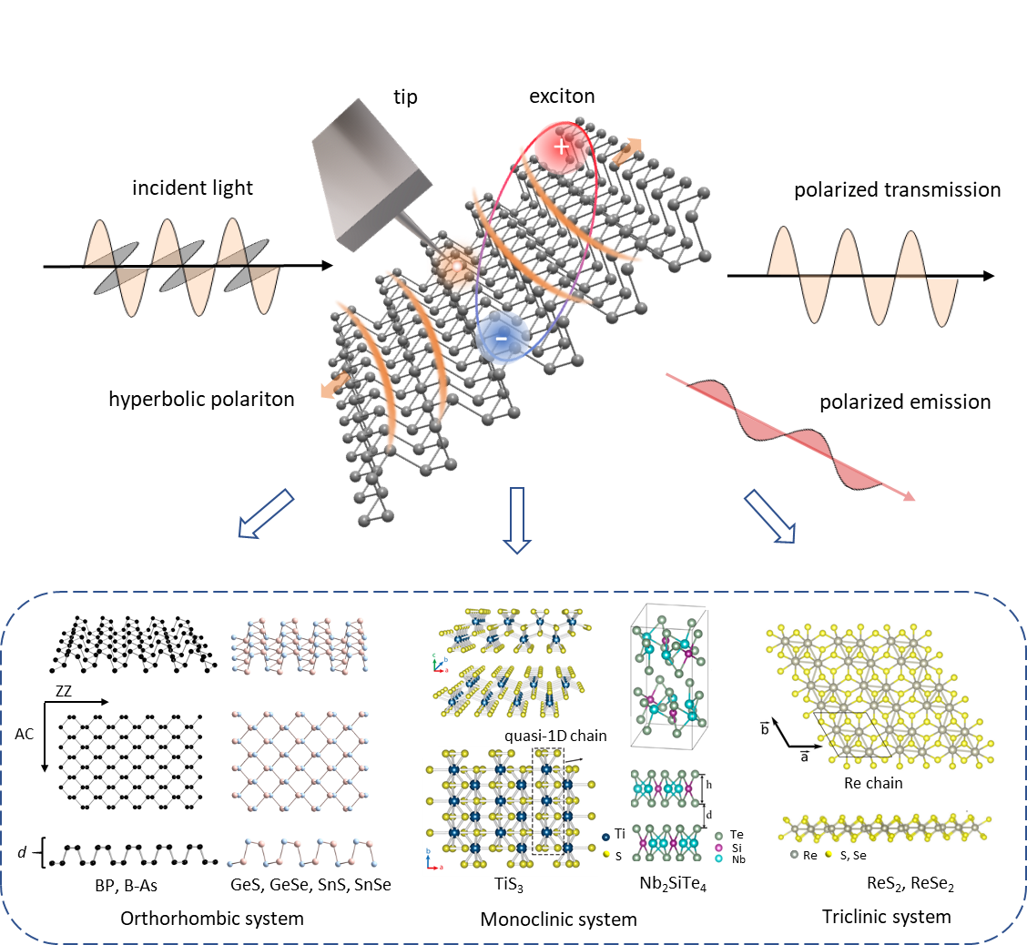 Low symmetry 2D materials with intrinsic in-plane anisotropic optical properties and high tunability provide a promising platform to explore and manipulate light–matter interactions. To date, dozens of in-plane anisotropic 2D materials with diverse band structures have been discovered. They exhibit rich optical properties, indicating great potential for novel applications in optics, photonics, and optoelectronics. In this paper, we thoroughly review the anisotropic optical properties and polaritons in many kinds of low symmetry 2D materials, aiming to elicit more research interest in this field. First, the optical properties of anisotropic 2D semiconductors, including interband absorption, photoluminescence, excitons, and band structure engineering for tuning optical responses, are introduced. Then fundamentals and advances in experiments of hyperbolic polaritons in anisotropic 2D materials, including phonon, plasmon, and exciton polaritons, are discussed. Finally, a perspective on promising research directions is given.