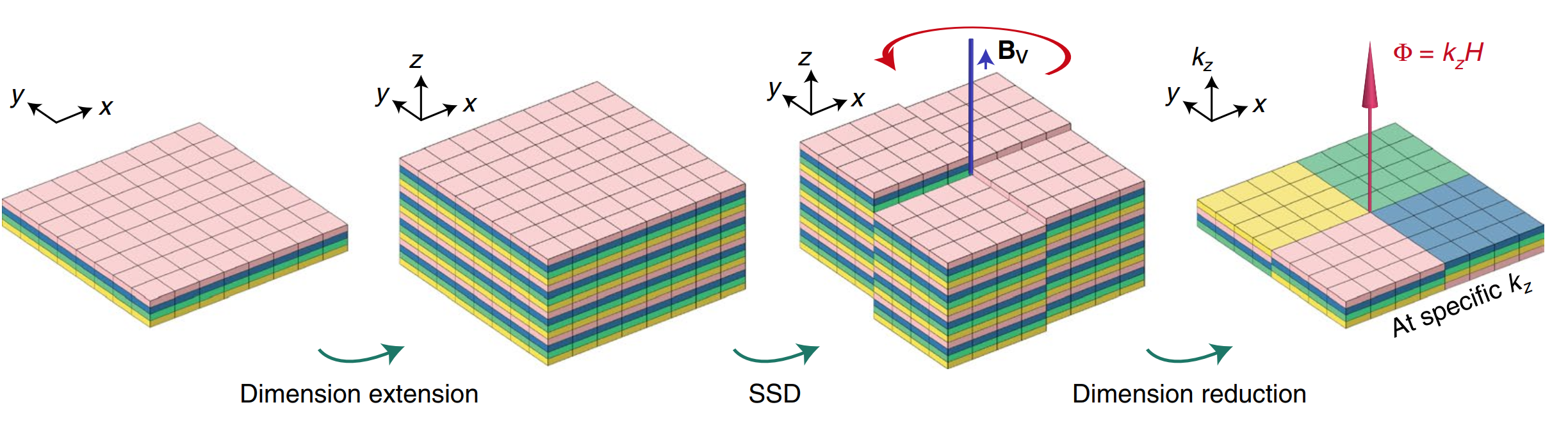 Fig. 1. Schematic illustration of the procedures that realize the single-plaquette gauge flux. The blue line and arrow indicate the dislocation line and the Burgers vector, respectively. Four colours represent layers of different heights. The red circular arrow indicates the chiral structure of the system.