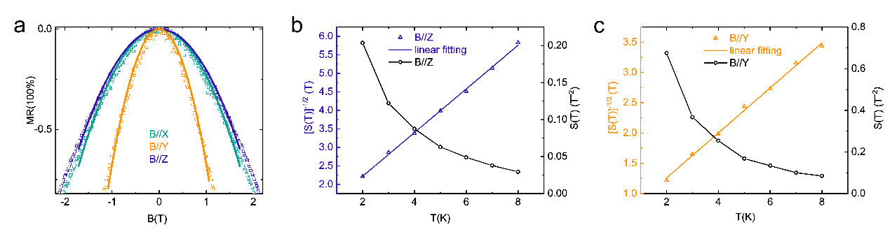 The Junxi Duan and Yugui Yao's team in BIT has been steadfastly committed to investigating the transport properties of novel topological and quantum materials. To realize the heterodimensional Kondo superlattice, the research team used VS2-VS heterodimensional superlattice as the representative system, which was first synthesized by Jiadong Zhou [Nature 609, 46–51 (2022)]. In the study, the team discovered: (1) The VS2-VS heterodimensional superlattice exhibited the low-temperature resistance upturn and the negative magnetoresistance (NMR), which are typical characteristics of the Kondo effect. Interestingly, the dependence of these two phenomena on the magnetic field showed strong anisotropy, as illustrated in Figure 1. (2) With a circular disc device, the anisotropic NMR is determined to originate from the anisotropic splitting of the Kondo resonance induced by magnetic anisotropy, as shown in Figure 2. (3) By extracting the Landé factor and Curie temperature, and combining with the first-principles calculations, the unique anisotropy Kondo effect is determined to originate from the magnetic anisotropy which has the root in the unique 1D chains in the structure, as depicted in Figure 3.
