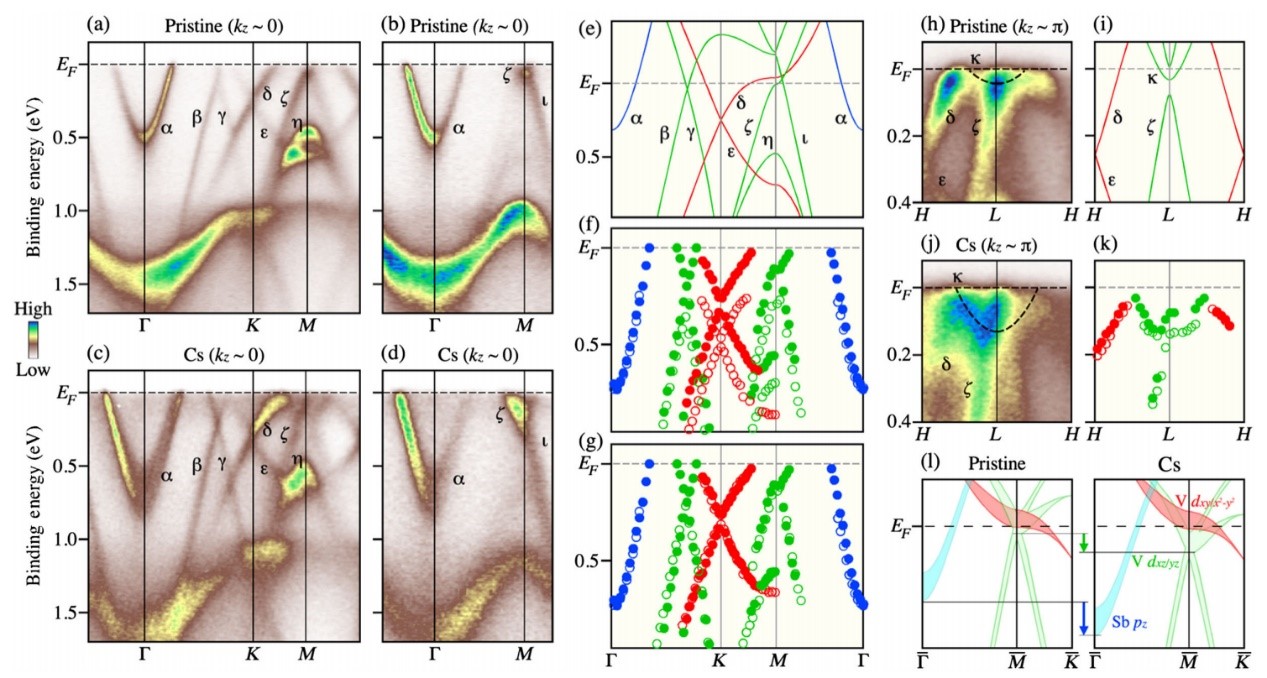 Fig.9. Electronic band structures of pristine and Cs-dosing CsV3Sb5 samples