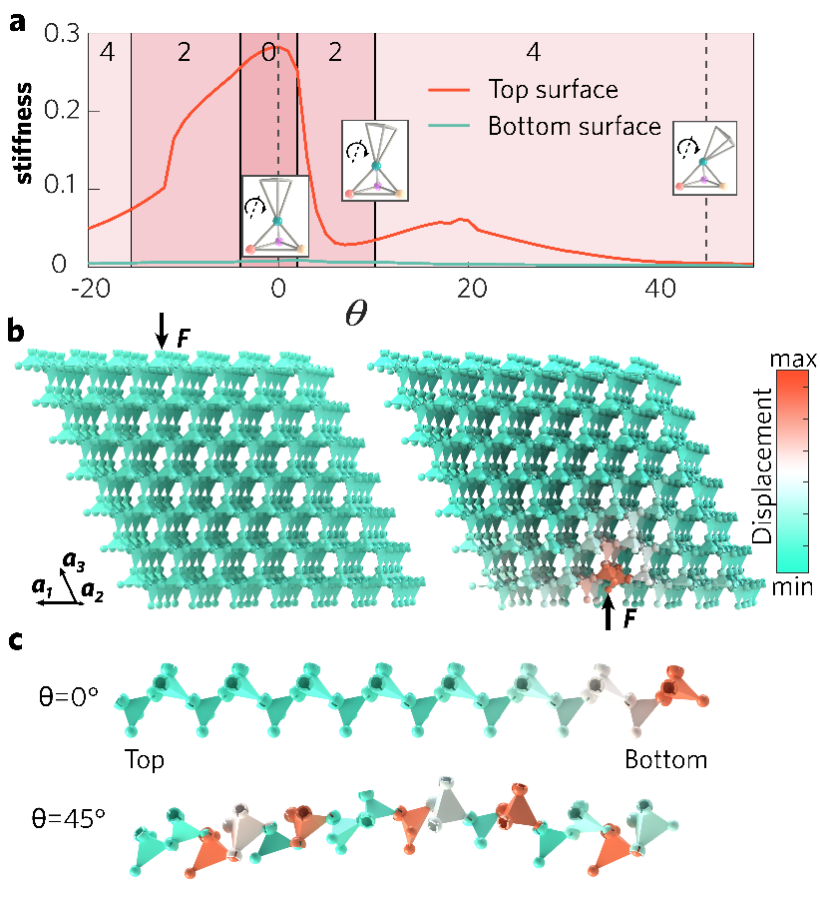 实验上,该团队对3D打印的广义焦绿石晶格进行了力-位移测量,图4(c, d)分别展示了θ=0°的完全拓扑极化相和θ=45°的外尔相的力-位移曲线。有别于外尔相上下表面近乎相同的力-位移曲线,完全拓扑极化的晶格,其上下表面的力-位移曲线展现出了显著的差异,表明力学软模只局域于晶格底部,晶格上表面则因此具有拓扑保护的刚度。