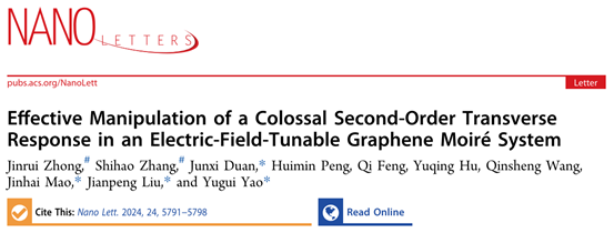 Jinrui Zhong#, Shihao Zhang#, Junxi Duan*, Huimin Peng, Qi Feng, Yuqing Hu, Qinsheng Wang, Jinhai Mao*, Jianpeng Liu*, and Yugui Yao*,“Effective Manipulation of a Colossal Second-Order Transverse Response in an Electric-Field-Tunable Graphene Moiré System”,Nano Lett. 24, 5791−5798 (2024) (#为共同一作,*为通讯作者)
