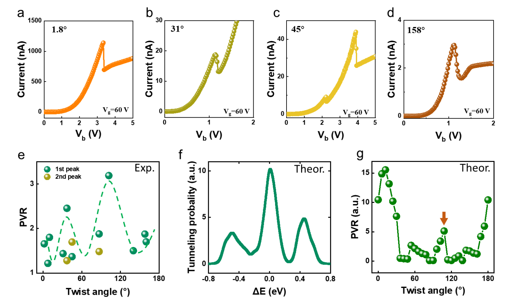 图4展示了不同扭转角度下的负微分电阻总结。图a-d展示了扭转角度为1.8°、31°、45°和158°时扭曲堆叠共振隧穿晶体管的隧穿电流与偏置电压的关系。图e展示了PVR随扭转角度变化的总结,显示在具有大扭转角度的扭曲堆叠共振隧穿晶体管中,PVR得到了增强(绿色虚线为参考线)。图f展示了计算的108°扭转角度扭曲堆叠共振隧穿晶体管的隧穿概率随能量偏移的变化。图g展示了理论计算的PVR随扭转角度变化,与(e)中的实验结果一致。