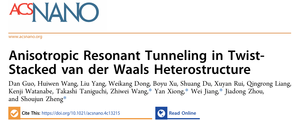 鉴于此,pg游戏电子模拟器郑守君研究员、蒋伟教授、王秩伟教授和熊嫣博士共同合作在ACS Nano在线发表“Anisotropic resonant tunneling in twist-stacked van der Waals heterostructure”的研究成果。研究者通过利用扭曲堆叠的1T’二硒化铼设计了一种二硒化铼/六方氮化硼/二硒化铼(ReSe2/h-BN/ReSe2)扭曲堆叠共振隧穿晶体管,表现出ReSe2间扭转角度可调的PVR,并在扭转角度为102°时达到最大。这种对两个ReSe2层之间的扭转角度的强烈依赖性归因于扭转角在隧穿过程中对ReSe2层中两个各向异性带的联合态密度的调节,显著抑制了谷电流,从而增强了PVR,这也得到了理论计算的支持。此外,该器件对温度和520nm光照的敏感性,表明可以通过温度和光照进一步调控PVR,并将其集成到光电应用中。这一发现不仅为通过堆叠工程设计共振隧穿器件提供了一种新方法,还为共振隧穿器件与光电应用的结合提供了可能。