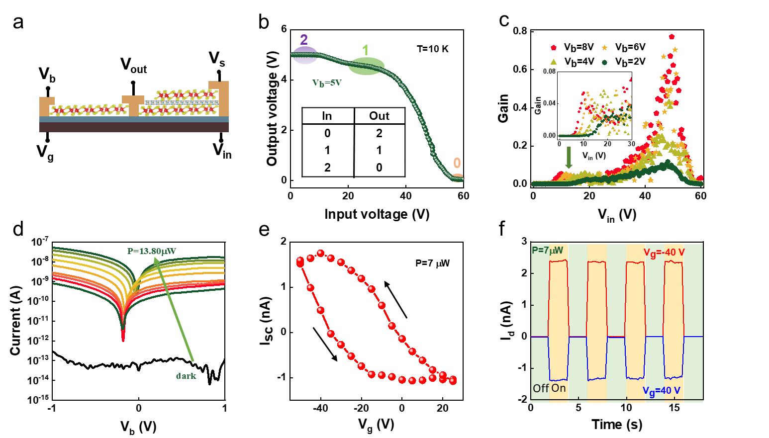 图5展示了基于扭曲堆叠共振隧穿晶体管的三值逻辑逆变器和可调自供电光电探测器的应用。图a展示了由158°扭曲堆叠共振隧穿晶体管和ReSe2 场效应晶体管组成的三值逆变器示意图。图b展示了逆变器输入电压与输出电压的关系,展示了三值的识别。图c展示了逆变器增益与输入电压的关系。图d展示了1.8°扭曲堆叠共振隧穿晶体管的功率依赖光电流与偏置电压的关系。图e展示了栅电压依赖的光伏电流,展示了自供电光电探测器的可调性。图f展示了在±40 V栅电压下的光伏电流耐久性测量。
