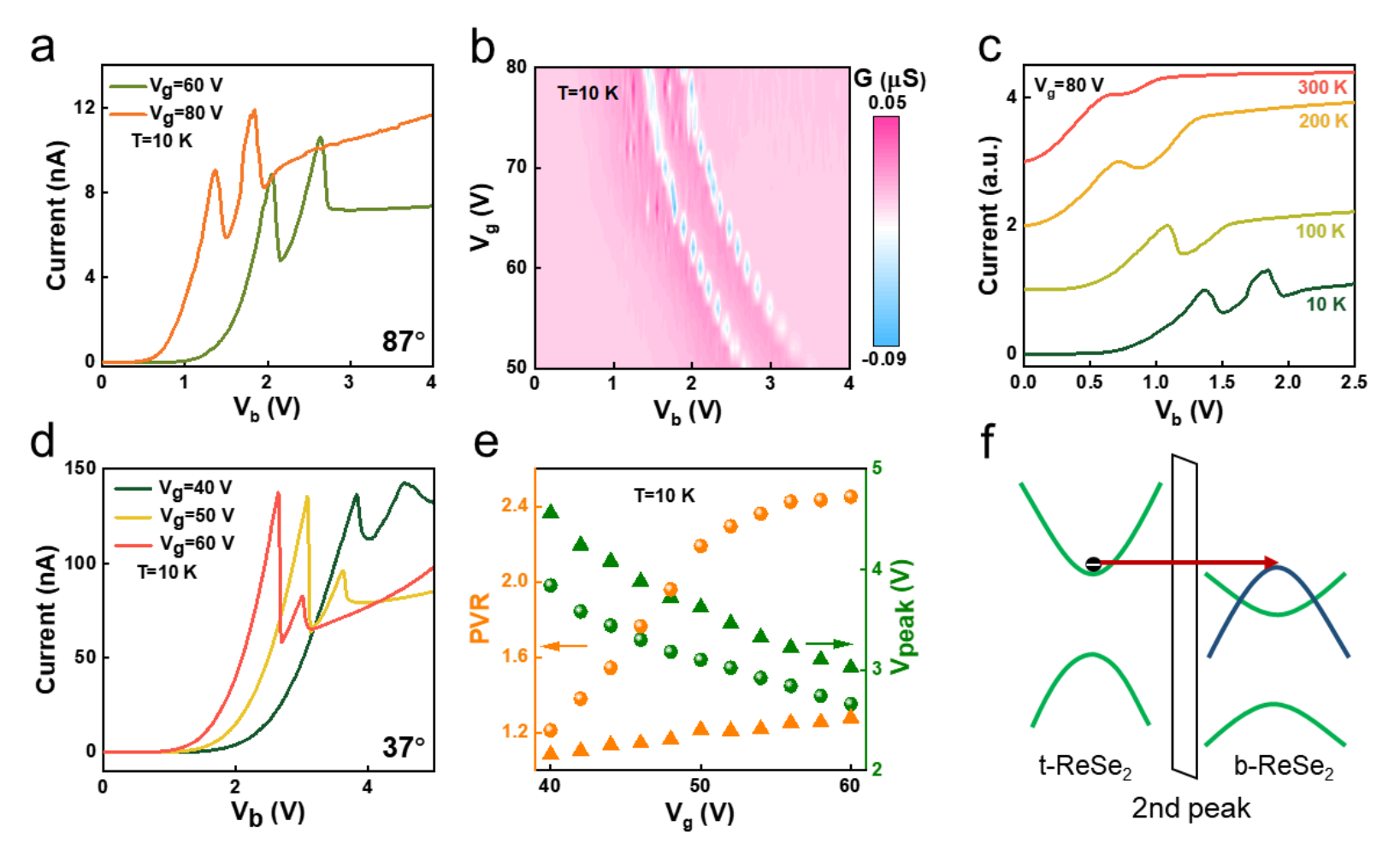 图3展示了扭曲堆叠共振隧穿晶体管中的双重负微分电阻峰。图a-c展示了87° TS-RTT中双重负微分电阻峰对栅电压和温度的响应。图d-e展示了37° 扭曲堆叠共振隧穿晶体管中双重负微分电阻峰和双重PVR对栅电压的响应。图f展示了能带对准的示意图,解释了双重负微分电阻峰的来源。