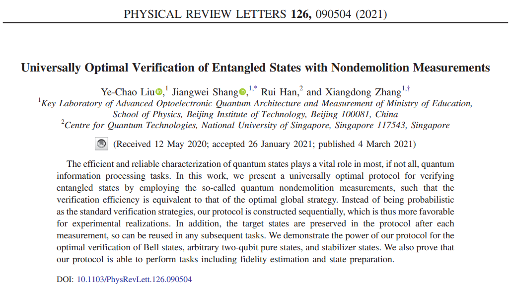 日前,pg游戏电子模拟器张向东教授和尚江伟副研究员课题组同新加坡国立大学量子科技研究中心韩睿博士合作,在量子验证研究领域取得重要进展,提出了基于非破坏测量的新的量子验证协议。该协议不仅可以达到最优的验证效率,而且可以实现保真度估计和态制备等其它任务。同时该协议的测量顺序是任意的,因而便于实验实现。相关研究成果发表在国际顶级期刊《物理评论快报》上。