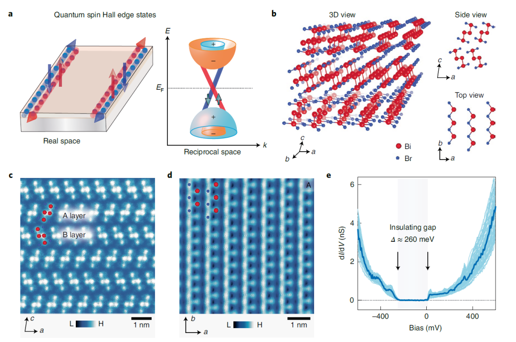 量子自旋霍尔绝缘体是一类体态绝缘、边缘导电的二维新奇体系,其边缘态是由体态拓扑性质导致的,不会受到非磁杂质的背散射,可实现理想的无耗散导电通道,在低能耗电子器件中有着巨大的应用前景。寻找和实现室温下的量子自旋霍尔绝缘体及其边缘态是通向相关器件应用的关键,姚裕贵团队及其合作者十多年来一直致力于寻找和研究大能隙的量子自旋霍尔绝缘体实现室温下的量子自旋霍尔效应。2014年姚裕贵教授和博士生周金健等预言了一种可行的大能隙量子自旋霍尔绝缘体材料,即Bi4Br4和Bi4I4体系。Bi4Br4单晶是具有层状结构的半导体,层间耦合是弱的范德瓦尔斯作用,理论计算发现其单层结构是量子自旋霍尔绝缘体且体能隙远高于室温条件[Nano Lett. 14, 4767 (2014)]。研究还发现Bi4Br4是探测室温量子自旋霍尔绝缘态的绝佳材料体系,一方面单层Bi4Br4是由无限长的一维链并排组成,链间的耦合相比链内耦合很弱,这种准一维结构特性有利于形成原子级平整的边缘,另一方面,由于极弱的层间耦合,量子自旋霍尔绝缘态可以稳定地存在于单晶Bi4Br4表面的台阶边缘上[NJP 17, 015004 (2015)]。