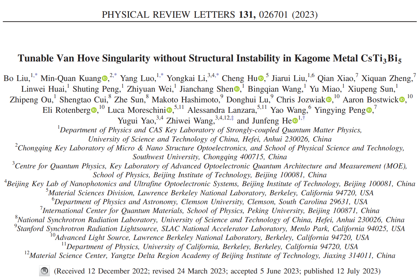 最近,北理工pg游戏电子模拟器王秩伟特别研究员、姚裕贵教授团队,与中国科技大学何俊峰教授、西南大学匡泯泉副教授等团队合作在新型笼目晶格材料CsTi3Bi5中取得进展。他们发现新型准二维笼目材料CsTi3Bi5具有CsV3Sb5相同的结构,是研究电子相关效应、拓扑物态和非常规超导电性等量子现象的一个良好平台。