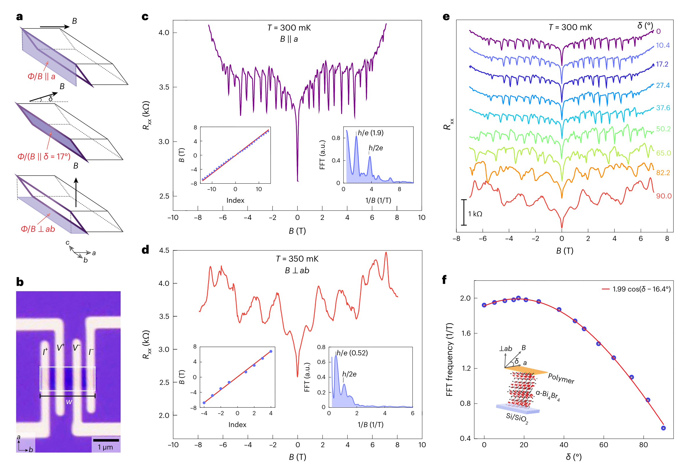图1. 在4层α-Bi4Br4中观测到的角度依赖的Aharonov–Bohm振荡。