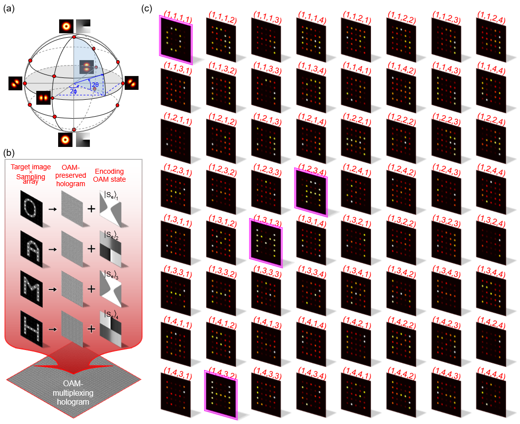 研究人员以四维OAM量子全息为例,验证了高维OAM量子全息能够提高全息图像加密的安全性这一结论。这里,四个目标图像为字母O、A、M和H;四个用于携带目标图像信息的OAM叠加态记为|Se>1、|Se>2、|Se>3、和|Se>4。将四个OAM选择性全息图复用在一起得到OAM复用全息图,如图4(b)所示。在目标图像的重构过程中,将OAM复用全息图加载于SLM-B上,而在SLM-A上加载不同的OAM态的相位全息图时,将会重构出不同的实验结果。图4(c)显示了64种重构的实验结果。从这些结果可以看出,只有在SLM-A上加载正确的OAM态的相位全息图(|Se>1、|Se>2、|Se>3、和|Se>4)时,才可以重构出字母O、A、M和H的图像(正确的重构结果已用紫色线框标出)。