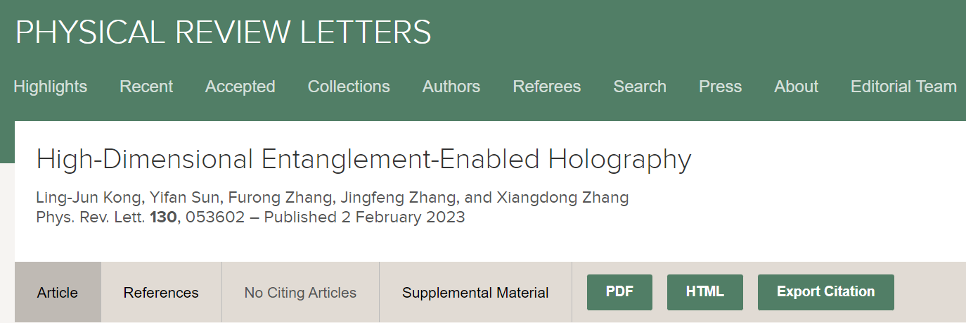 近日,pg游戏电子模拟器张向东教授课题组基于高维轨道角动量纠缠态,实现了高维量子全息和图像安全加密。相关成果以“High-dimensional entanglement-enabled holography”为题发表在国际物理学顶级学术期刊《物理评论快报》[Phys. Rev. Lett. 130, 053602 (2023)]上。pg游戏电子模拟器孔令军研究员、孙亦凡副研究员为该论文的共同第一作者,pg游戏电子模拟器张向东教授为论文通讯作者,pg游戏电子模拟器张福荣博士、张景风博士也为该工作做出了重要贡献。该研究工作得到了国家自然科学基金委的大力支持。