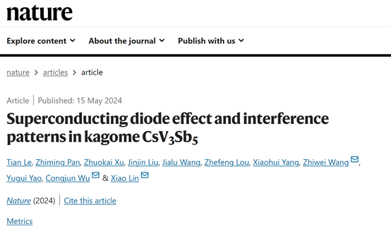 2024年5月15日,pg游戏电子模拟器王秩伟教授、姚裕贵教授团队,与西湖大学林效教授、吴从军教授团队等人合作,在《自然》杂志上在线发表题为“Superconducting diode effect and interference patterns in kagome CsV3Sb5”的研究论文。首次在笼目晶格超导材料CsV3Sb5中观察到了零磁场超导二极管效应和超导干涉条纹,在一定程度上证明了CsV3Sb5中超导态具有时间反演对称性破缺的特征。
