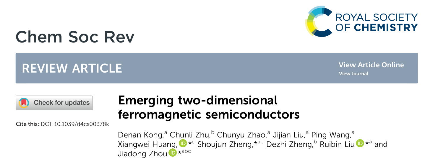 文章信息(*为通讯作者):Denan Kong, Chunli Zhu, Chunyu Zhao, Jijian Liu, Ping Wang, Xiangwei Huang,* Shoujun Zheng,* Dezhi Zheng, Ruibin Liu* and Jiadong Zhou*,“Emerging two-dimensional ferromagnetic semiconductors”,Chem. Soc. Rev., 2024.