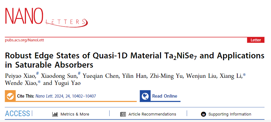 Peiyao Xiao#, Xiaodong Sun#, Yueqian Chen,Wenjun Liu,Yilin Han,Zhi-Ming Yu,Xiang Li*, Wende Xiao*, Yugui Yao,“Robust Edge States of Quasi-1D Material Ta2NiSe7 and Applications in Saturable Absorbers” Nano Lett. Nano Lett. 24, 10402-10407 (2024) (#为共同一作,*为通讯作者)