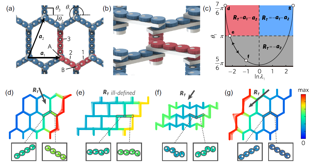 该团队利用上述一维链作为基本单元,构建了支持非线性拓扑相变的二维力学模型。如图2(a,b)所示,该体系可以通过集体孤子波实现拓扑相变,拓扑相图如图2(c)所示,图2(d,e,f,g)展示了该二维体系由“右边软”,转变为“左边软”,进而实现了超材料两侧边界刚度对比完全翻转。