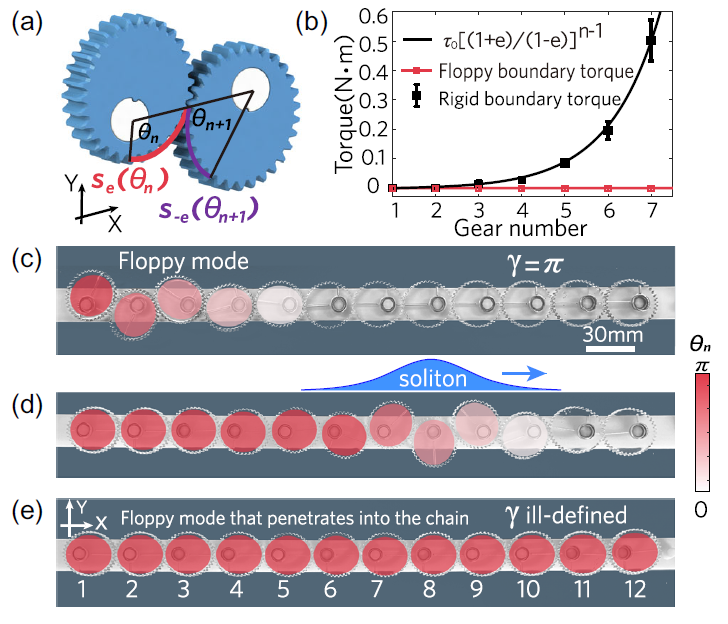 图1(a):椭圆齿轮链单元;(b)椭圆齿轮链扭矩对比及其与齿轮数的关系;(c)软模在左侧,左边可以自由扭动;(d)孤子波传播;(e)软模在右侧,右侧可以自由扭动。