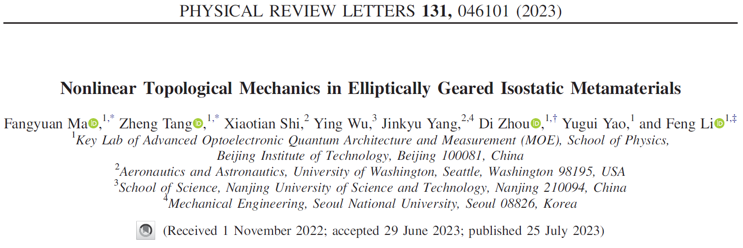 2023年7月25日,Physical Review Letters在线发表题为“Nonlinear Topological Mechanics in Elliptically Geared Isostatic Metamaterials”(非线性椭圆齿轮力学超材料)的科研论文。该研究由pg游戏电子模拟器的姚裕贵教授、周迪副教授和李锋教授团队完成,pg游戏电子模拟器的博士生马方垣和汤正为该论文的共同第一作者。pg游戏电子模拟器是该研究的第一单位。