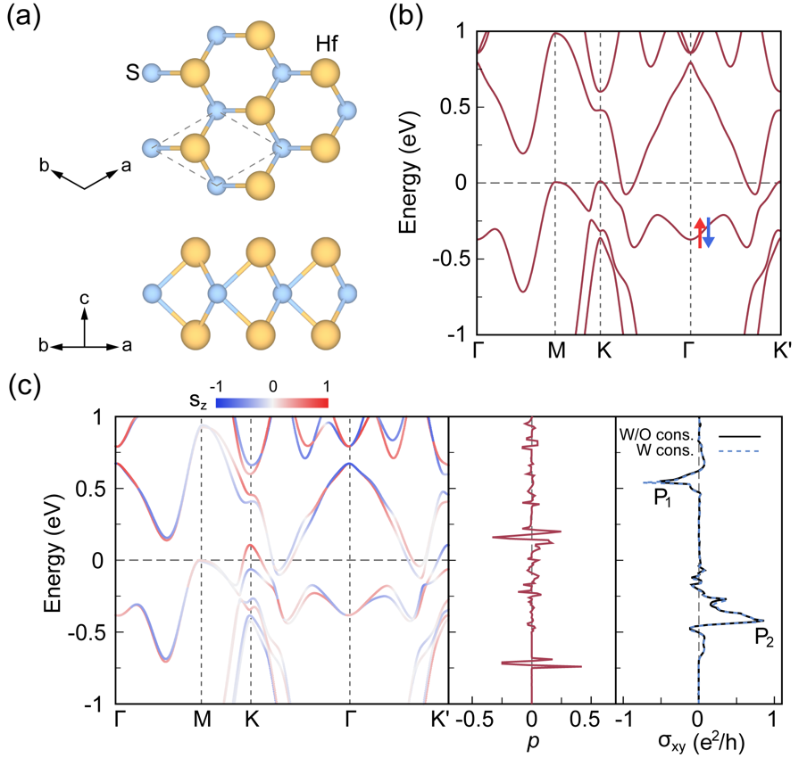 图2:(a) Hf2S的晶体结构;(b) 非相对论能带;(c) sz投影的相对论能带、自旋极化率p和反常霍尔电导率σxy。