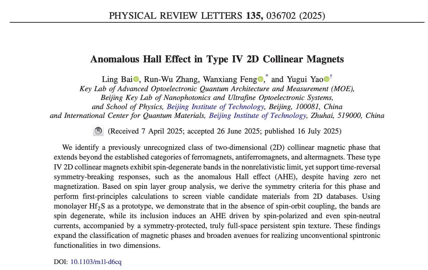 文章信息(*为通讯作者):Ling Bai, Run-Wu Zhang, Wanxiang Feng*, Yugui Yao*, “Anomalous Hall Effect in Type IV 2D Collinear Magnets”, Phys. Rev. Lett. 135, 036702 (2025).