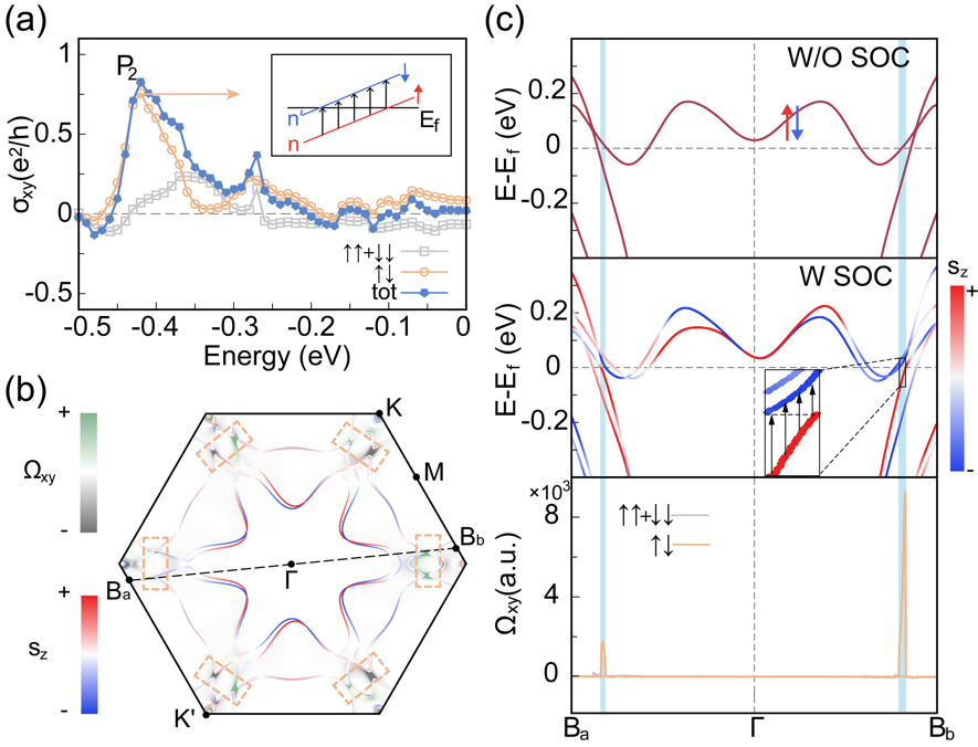 图3:(a) 自旋守恒、自旋翻转及总的反常霍尔电导率σxy;(b) P2处sz投影的费米面及贝里曲率Ωxy;(c) 动量空间Ba-Γ-Bb路径上的非相对论和相对论能带、以及P2处的贝里曲率Ωxy。