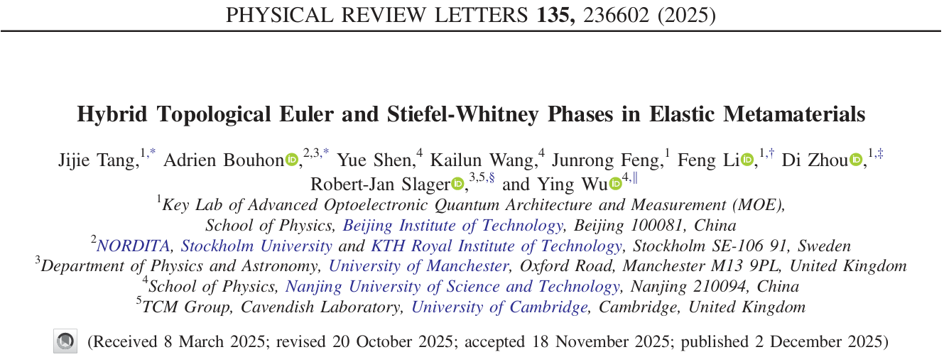 北理工团队基于弹性超材料的矢量波实现混合拓扑Euler和Stiefel-Whitney相
