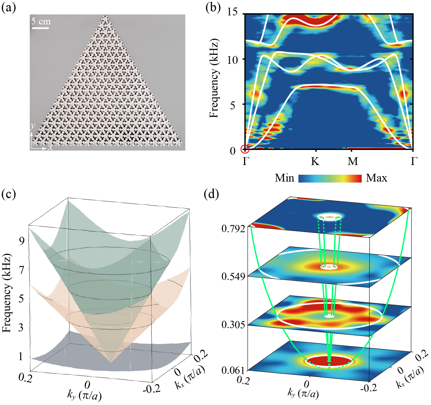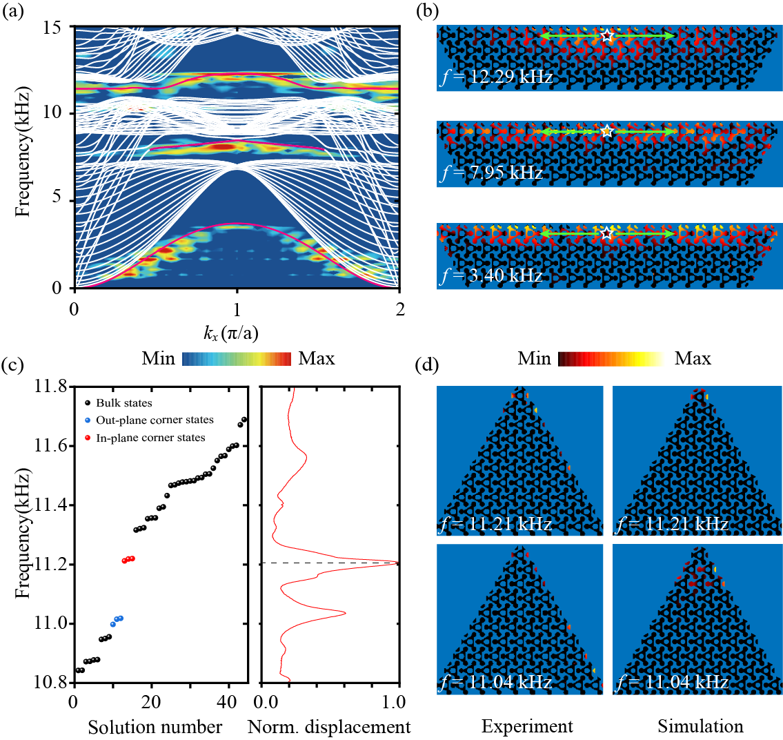 在实验上,团队通过金属3D打印制备了边长为20个原胞的三角形样品如图2(a)。测量得到的完整矢量色散如图2(b)所示,除第一条面外模式外,第二、三条面内模式也被清晰探测,对应的Euler与SW拓扑带隙明显可见。此外,图2(c,d)展示了具有“电荷”q=−1和欧拉类e1=±1的Γ点色散曲线。