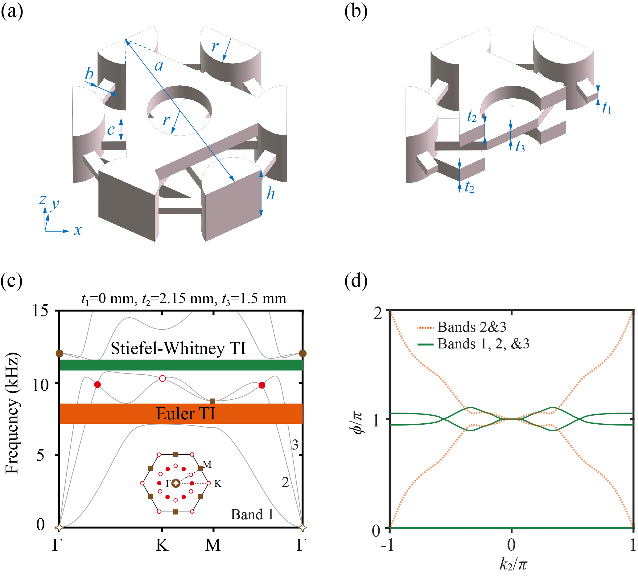 迄今,多带隙拓扑物性在经典波系统中已取得重要实验进展,但现有成果主要集中在标量波超材料(如空气声学系统)中,并已分别实现Euler相或Stiefel-Whitney相。相比之下,矢量弹性波系统的耦合机制更为复杂,但同时也具备更高的物性可调性与工程实用潜力。以往研究中,为简化模型与分析,弹性波常被近似处理为标量波,但这掩盖了其全矢量特性,阻碍了潜在拓扑现象的发掘。因此,一个关键问题随之产生:能否在单一的矢量弹性波系统中,同时实现Euler相、Stiefel-Whitney相乃至二者的混合拓扑相?