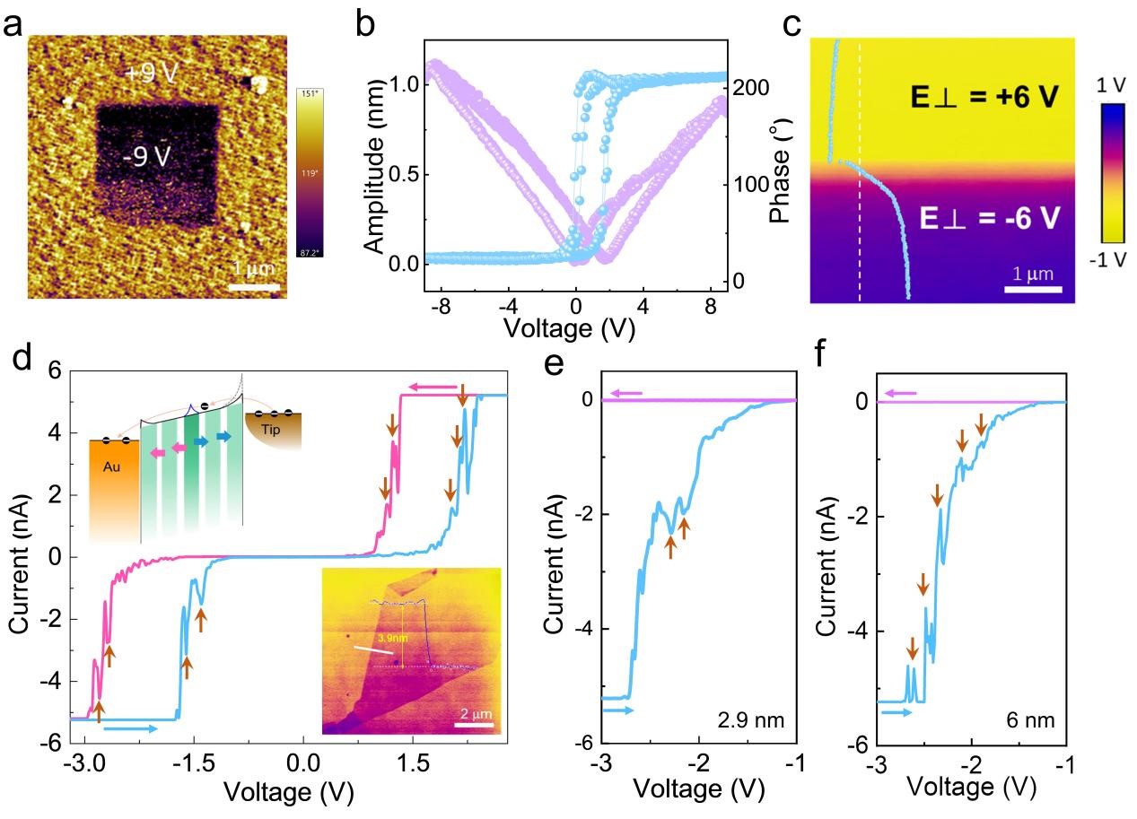 图 2展示了具有多态性的γ-InSe滑动铁电性。a) 用Dart-PFM以写畴模式(±9 V)对 23 纳米厚的γ-InSe薄片进行相位映射,清楚地显示出可切换的铁电OOP相位。b) PFM的外场相位和振幅磁滞回线有两个循环。c) 在 ±6 V 电场下对 10 纳米厚的 γ-InSe薄片进行的 KPFM 映射。沿白色虚线的 KPFM 振幅(蓝线)图示于插图中。d) 通过C-AFM测量得到的 3.9 纳米厚的 InSe 薄片的I-V曲线,具有明显的磁滞和多次电流跳跃。AFM图像和厚度显示在底部插图中,能带排列显示在顶部插图中。e) 2.9 纳米厚的InSe薄片的 I-V曲线,显示出较少的电流跳跃。f) 6 纳米厚的InSe薄片的I-V曲线,显示出更多的电流跳跃,表明根据层数的不同存在多态性。