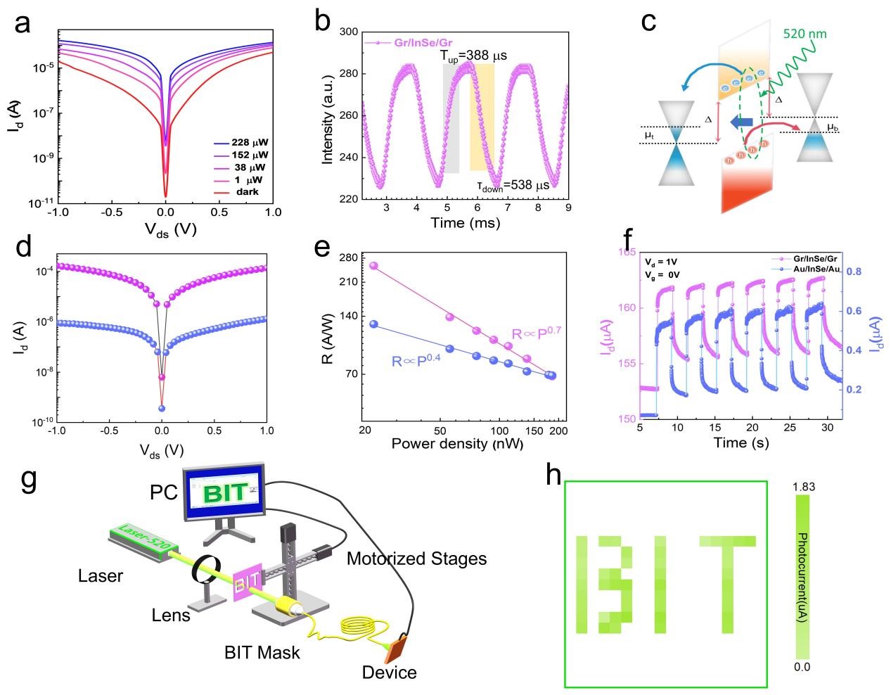 图5展示了γ-InSe隧穿器件的光响应性能。a) 石墨烯/γ-InSe/石墨烯范德华光电探测器在不同光强下的I-V曲线。b) 光电探测器的光响应,显示出 388 μs 的上升时间和 538 μs 的衰减时间。c) 石墨烯/γ-InSe/石墨烯结构的能带排列示意图。d) 在 25 μW 光照下,石墨烯/γ-InSe/石墨烯垂直器件(紫色曲线)和 Au/γ-InSe/Au 横向器件(蓝色曲线)的I-V曲线对比。e) 两种器件的响应度随功率密度的变化关系。f) 两种器件在 1 V 外加电压下的光电流持久性测试。g) 基于石墨烯/γ-InSe/石墨烯光电探测器的实时成像示意图。h) 基于 520 nm 光照射的单像素成像系统获取的“BIT”标志。