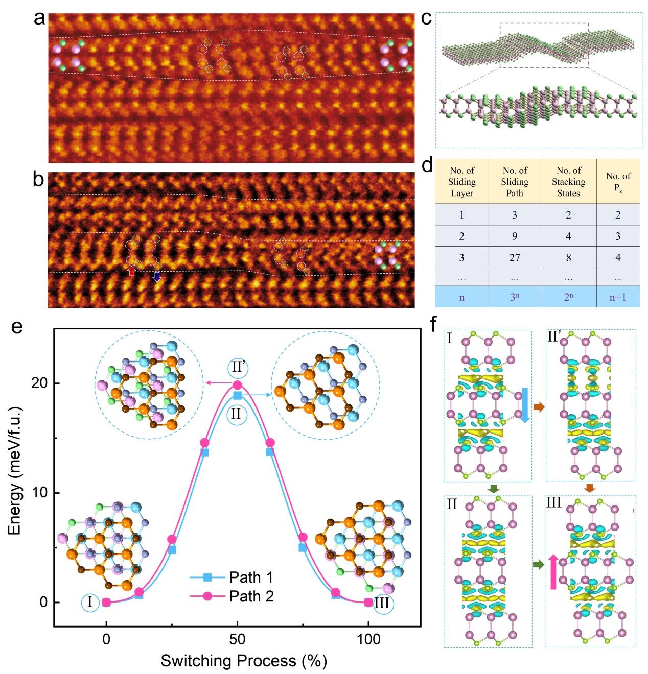 图4展示了γ-InSe中的多条滑动路径。a) 对极化和光照后的石墨烯/γ-InSe/石墨烯进行HAADF-STEM成像,可以看到圆顶状畴壁。虚线表明存在层间滑动和畴壁产生。b) 同一器件的 HAADF-STEM 图像,有多个畴壁,其原子位置在底部极化和顶部极化时均发生重排。c) 具有畴壁产生(顶部)的 InSe 单层示意图和畴壁的侧视图(底部)。d) 关于滑动层数的所有滑动路径、堆叠状态和极化状态的总结。e) 两个不同方向滑动路径的能量分布曲线显示出微小的能量差异。f) 四种典型堆叠状态的差分电荷密度分布。黄色和蓝色等势面分别是电子积累和耗尽,代表了层间滑动过程中电子云的非等效分布。