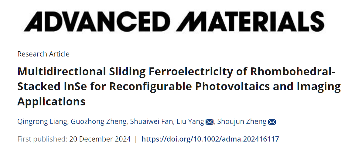 通过二维材料的堆叠技术,可通过层间滑动来切换界面极化,这被称为滑动铁电性,它在超薄厚度、高切换速度和高抗疲劳性方面具有优势。然而,揭示菱面体堆叠材料中滑动路径与极化状态之间的关系仍然是一个挑战,这是实现二维滑动铁电性的关键。鉴于此,pg游戏电子模拟器郑守君研究员和三峡大学杨柳博士共同合作在Advanced Materials在线发表“Multidirectional Sliding Ferroelectricity of Rhombohedral-stacked InSe for Reconfigurable Photovoltaics and Imaging Applications”的研究成果(pg游戏电子模拟器为第一单位,Adv. Mater. , 2416117, (2024))。在这项研究中,我们利用双频共振追踪压电响应力显微镜(Dart-PFM),导电原子力显微镜(C-AFM)和扫描隧道显微镜(STEM)对菱面体堆叠的 InSe(γ-InSe)中与层相关的自发极化状态和多向滑动路径进行了实验研究。这种多向滑动机制通过电场确保了石墨烯/γ-InSe/石墨烯范德华异质结构中的可调体光伏效应。扫描透射电子显微镜(STEM)数据阐明了多层γ-InSe 中的畴壁产生和多向滑动机制,这与理论计算结果一致。我们的工作不仅深入了解了菱面体堆叠二维材料的多向滑动铁电性,还突显了它们在可调节光伏和成像应用中的潜力。