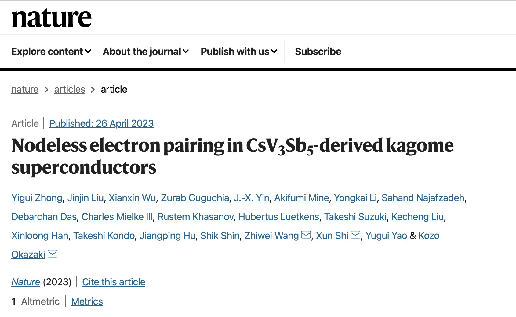近日,pg游戏电子模拟器姚裕贵教授、施训教授、王秩伟研究员团队,与东京大学钟益桂博士、Kozo Okazaki教授,中科院理论物理研究所吴贤新研究员,南方科技大学殷嘉鑫教授和瑞士保罗谢勒研究所Zurab Guguchia教授等人合作在《自然》杂志发表论文“Nodeless electron pairing in CsV3Sb5-derived kagome superconductors”,揭示了笼目超导体中稳健的无节点超导能隙,为研究其超导配对机理提供了关键实验依据。
