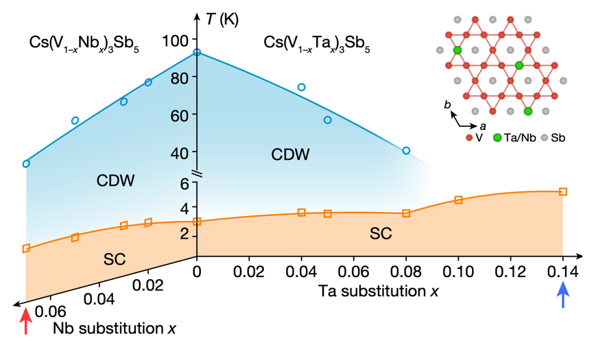 进一步地,研究人员通过细致的化学替换,将部分钒原子可控地替换为同族更大的铌或钽原子,从而精确调控超导序和电荷密度波序(图2)。通过对相图中有无电荷密度波序的区域进行比对研究,发现超导能隙均显示为无节点和各向同性(图3)。如此稳健的能隙结构极大缩窄了超导配对对称性的候选范围,同时结合缪子散射实验发现该超导态破坏时间反演对称性,指向了d+id波超导配对的可能性。