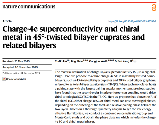 该工作相关论文“Charge-4e superconductivity and chiral metal in 45°-twisted bilayer cuprates and related bilayers”发表在Nat. Commun. 14, 7926 (2023)。pg游戏电子模拟器杨帆教授为论文唯一通讯作者。杨帆教授指导的博士生刘玉波和重庆邮电大学周晶讲师为论文共同第一作者。参与论文工作的还有西湖大学的吴从军教授。论文受到国家自然科学基金重点、面上项目资助。