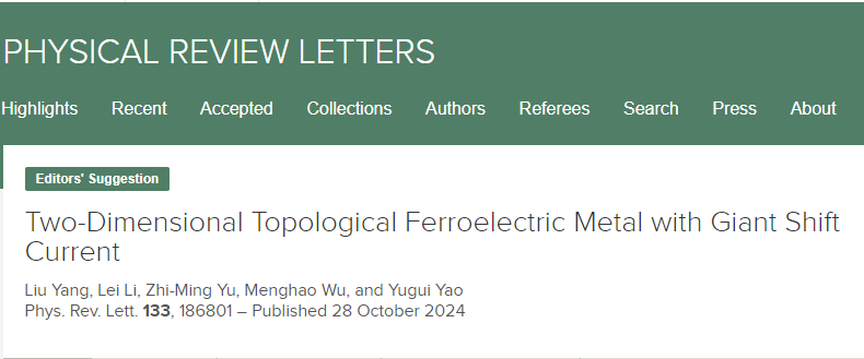 近期,pg游戏电子模拟器姚裕贵教授团队与华中科技大学吴梦昊教授团队合作,在理论上预言了一种具有空前巨大体光伏效应的本征二维拓扑铁电金属。相关研究成果以题为 “Two-dimensional Topological Ferroelectric Metal with Giant Shift Current” 的论文发表在国际顶级物理学期刊《Physical Review Letters》上,并被该期刊选为 “Editors’ Suggestion”。