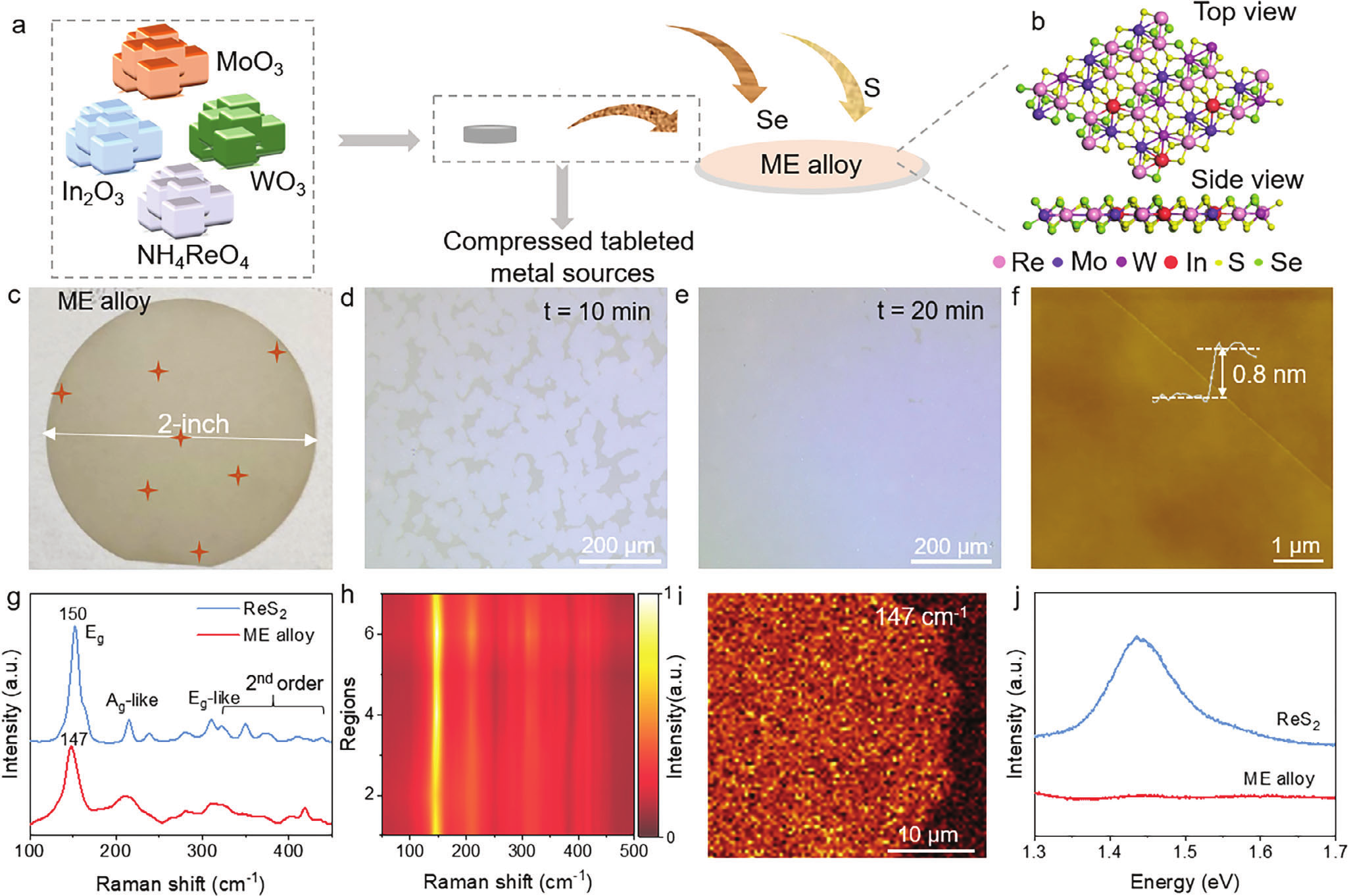 本工作采用以NH4ReO4, WO3, MoO3及 In2O3粉末压制所得的片材作为金属源前驱体,S和Se的混合粉末提供非金属源,C面蓝宝石作为衬底,在三温区低压系统中通过CVD法制备ReaWbMocIndSxSey六元中熵合金。通过光学照片可确认2英寸中熵合金薄膜的平整性和均匀性。原子力显微镜的结果表明中熵合金具有原子级的单层厚度(0.8 nm)。由于中熵合金单层的主体结构为ReS2,因此可推断出,其拉曼振动相对于ReS2的变化归因于W、Mo、In和Se等元素的引入。2英寸中熵合金晶圆上随机选取的7个位点的拉曼光谱和147 cm-1波数处的拉曼mapping表明中熵合金具有良好的均匀性。荧光光谱表明ReS2的带隙为1.44 eV,而中熵合金却发生了荧光的猝灭,这是由于W、Mo、In和Se等元素的掺杂引起的。