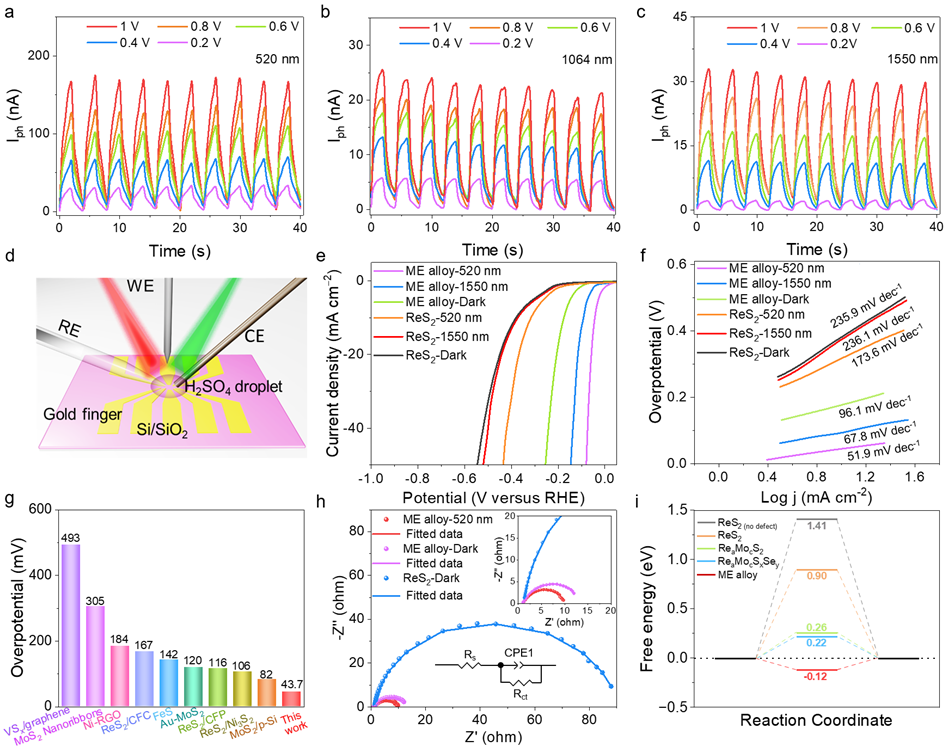 中熵合金从可见到近红外范围内均具有明显的光响应。电催化性能测试表明,该中熵合金在520 nm波长激光下具有最小的过电位、塔菲尔斜率和电荷转移阻抗。此外,中熵合金的ΔGH*值为-0.12 eV,表明其优异的H吸附/脱附能力,以上结果证实了熵工程的有效性。