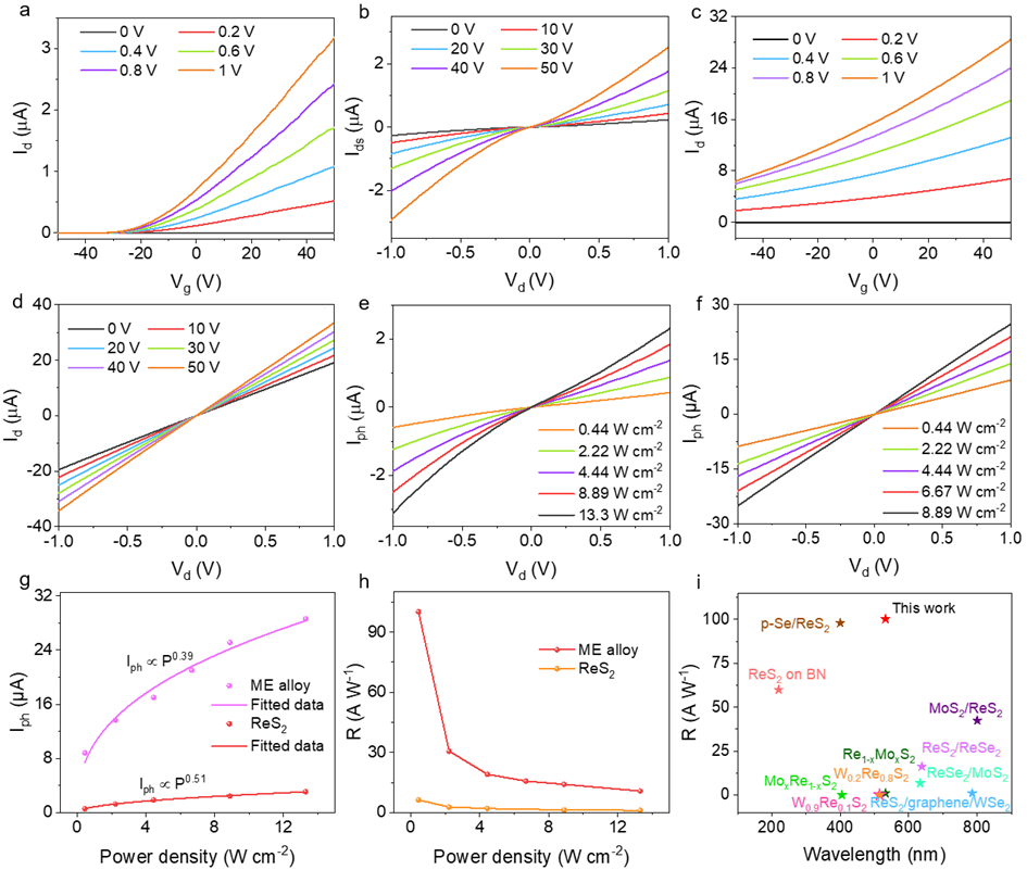 从ReS2和中熵合金的转移曲线可知,两者均具有n型的导电类型。两者输出曲线差异较大,这是由于ReS2和中熵合金与金属电极之间接触不同所导致的,前者为肖特基接触,后者是欧姆接触。ReS2和中熵合金在不同光功率下(520 nm波长激光)拟合的陷阱态相关值分别为0.51 和 0.39。经计算,中熵合金的最大响应度为100.2 A W⁻1,是ReS2(6.8 A W⁻1)的14.7倍,并超过之前报道的Re基材料。