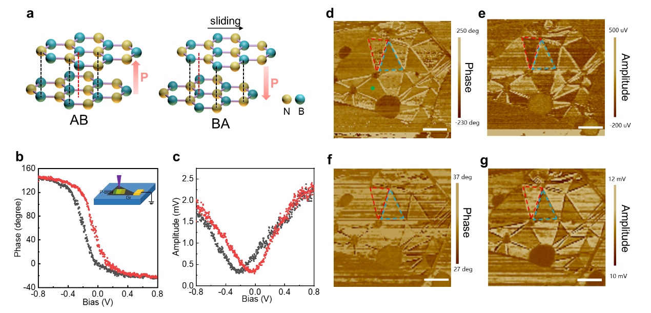 图1展示的 PS-BN 的可切换铁电畴。图a展示了具有 AB 和 BA 堆叠顺序的 PS-BN 结构图,其中层间极化由硼(蓝色)和氮(黄色)原子的排列产生。图c和图b展示了垂直 PFM 相位和振幅滞后回线分别与所施加的尖端偏压成函数关系。图d和图e 展示了在少层石墨烯上的 PS-BN的PFM 振幅和相位映射,显示出明显的 AB 和 BA 铁电畴。图f和图g 展示了PS-BN 在施加 1 V 直流电压时的PFM 相位和振幅图像,展示了可切换的铁电畴。