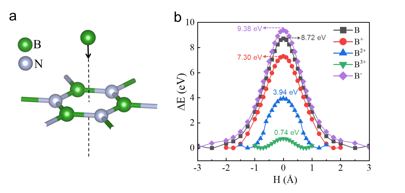 图4展示了原子/离子穿过 h-BN 层所需的迁移能。图a展示了h-BN 层的原子结构,B 原子/离子位于六边形中心上方。B 原子/离子沿黑色虚线移动,穿过 h-BN 层。图b展示了系统能量(ΔE)与 H(B 原子/离子距离 h-BN 层的高度)的函数关系。分别展示了中性 B 原子(黑线)、带一个正电荷的 B+(红线)、带两个正电荷的 B2+(蓝线)、带三个正电荷的 B3+(绿线)和带一个负电荷的 B-(紫线)的能量势垒。