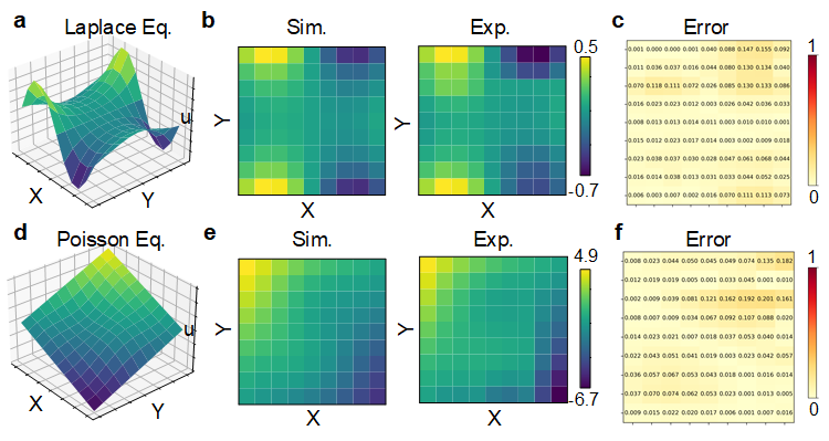 图2. a-c:Laplace方程求解结果与误差,求解精度为95.9%;d-f:Possion方程求解结果,求解精度为95.8%。