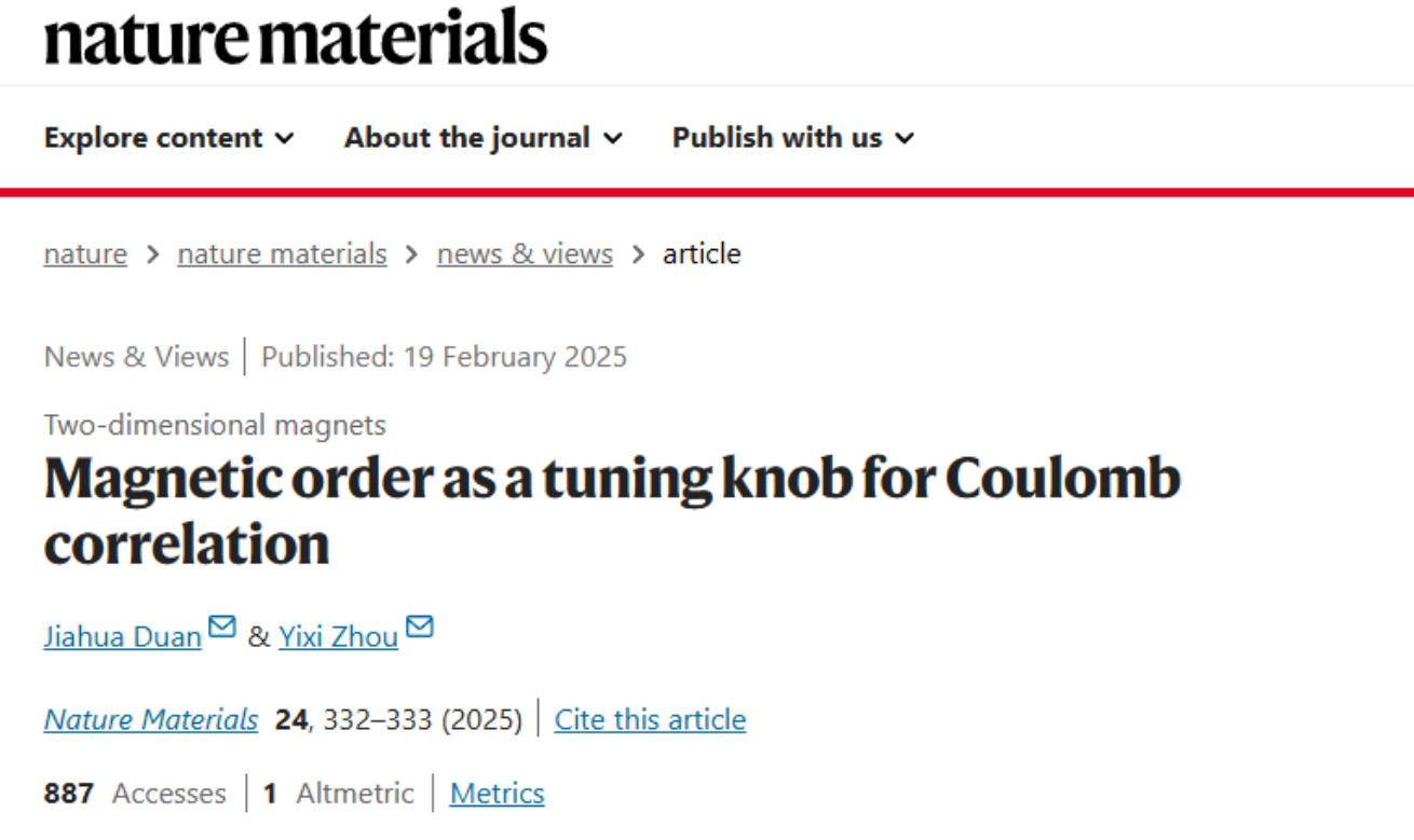 此外,Nature子刊《Nature Materials》邀请pg游戏电子模拟器段嘉华教授撰写发表评述性论文,文章题为“Magnetic order as a tuning knob for Coulomb correlation”。论文评述了哥伦比亚大学Dimitri Basov院士团队和雷根斯堡大学R. Huber教授团队在Nature Materials发表的背靠背论文[Nature Materials 24, 384 (2025); Nature Materials 24, 391 (2025)],介绍了二维反铁磁材料中库伦相互作用调控研究的重要进展。研究表明二维CrSBr材料中的A类反铁磁序会阻碍电子-空穴对的层间跃迁,从而导致一种新的具有一维量子限域的光激发态:磁性表面激子。这一发现有助于理解二维磁性材料中的多体物理效应,而反铁磁序带来的限域效应将为纳米尺度上能量传输调控提供新的可能性。