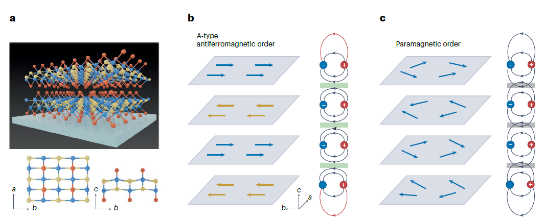 图中展示了磁序对二维磁铁中电子-空穴对的调制作用。图a为二维半导体磁性材料CrSBr的晶体结构示意图,可以看出其为A类反铁磁铁,即层内铁磁性和层间反铁磁性。图b和图c分别展示了A类反铁磁性和顺磁性时CrSBr中的电子-空穴对层间相互作用,可以看出A类反铁磁序会屏蔽激子层间相互作用。