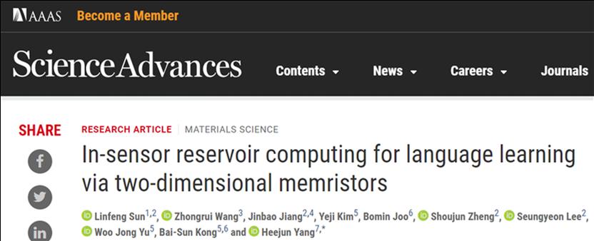Linfeng Sun, Zhongrui Wang, Jinbao Jiang, Yeji Kim, Bomin Joo, Shoujun Zheng, Seungyeon Lee, Woo Jong Yu, Bai Sun Kong and Heejun Yang*, “In-sensor reservoir computing for language learning via two-dimensional memristors”, Science Advances, 7, 20, 2021 (eabg1455).