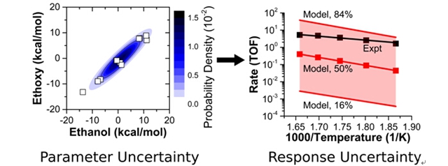 郭伟副研究员与美国的合作伙伴共同努力,通过乙醇和水蒸气在Pt/Al2O3表面的重整化产氢的动力学模拟,定量分析了模型中参数的不确定性和参数之间的关联效应如何影响模型预测的准确度。他们通过第一性原理计算,考虑了10多种目前主流的交换关联泛函,从而确定了乙醇和乙氧基生成焓的不确定性,以及在不同交换关联泛函下这种不确定性的关联效应。接着,通过动力学模拟和全局灵敏度分析,他们发现尽管模型中有很多的参数,但由于参数之间的关联效应,只有少数几个最终对产氢速率产生决定性的影响。因此,可以通过更高精度的实验或计算方法来改善这些少数关键参数的准确度,从而提高材料设计的可靠性和效率。在这个具体的例子中,他们还揭示了模型计算比实验测定的产氢速率低的原因是,在(111)表面模拟得到的表观活化能比真实值高,这就意味着比起常见的(111)低指数晶面,其它活性位和反应路径扮演着更重要的角色。