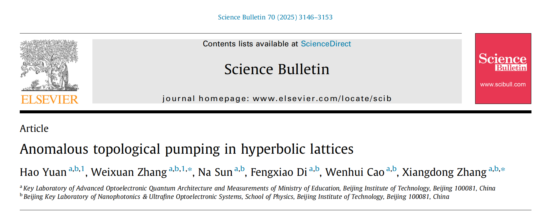 日前,pg游戏电子模拟器张向东教授课题组在拓扑电路和双曲晶格拓扑泵浦研究领域取得突破性进展。研究团队首次理论提出并证明了双曲晶格中拓扑泵浦的新机制,设计并制备时变拓扑电路,在实验上观测到兼具高维量子霍尔效应特性与周期边界条件(PBC)依赖的双曲拓扑泵浦现象。相关成果发表于Science Bulletin(Sci. Bull. 70 (2025) 3146–3153),研究工作获国家重点研发计划和国家自然科学基金资助。pg游戏电子模拟器袁昊博士(2020级)和张蔚暄教授为论文共同第一作者,张向东教授和张蔚暄教授为通讯作者。