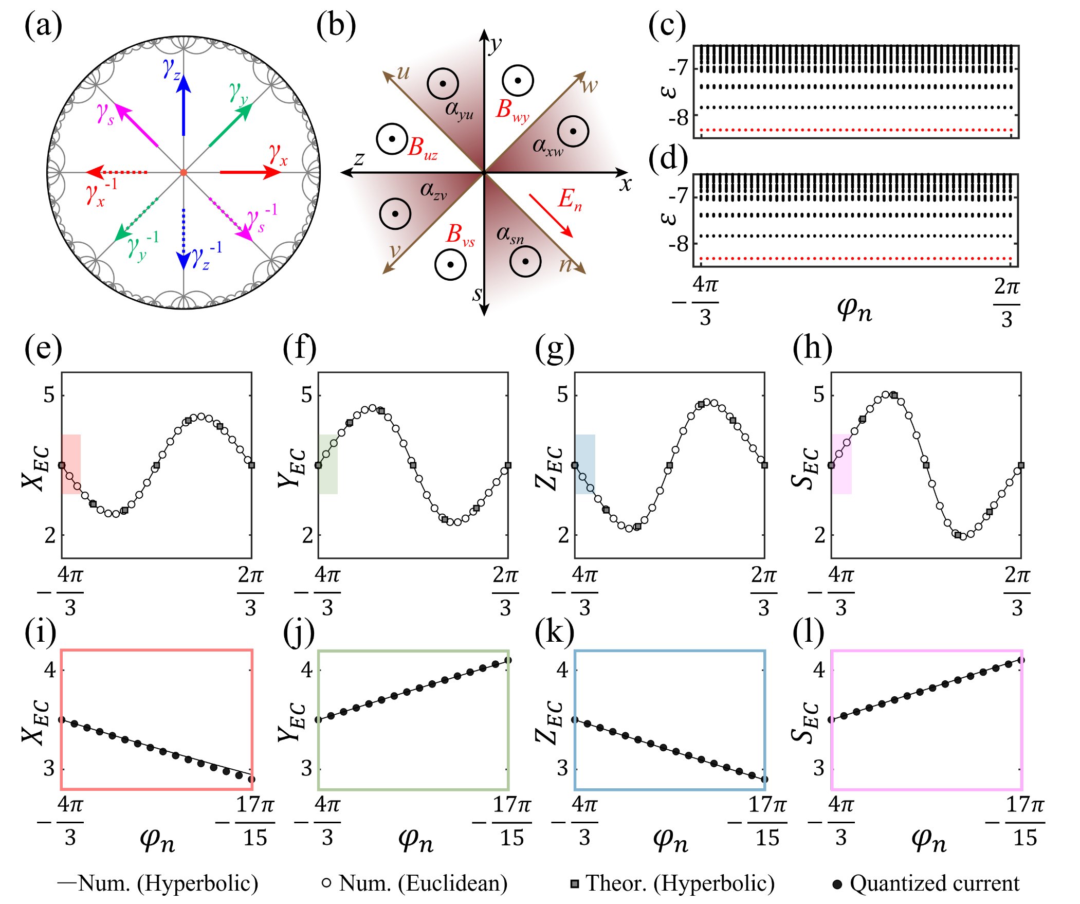 被绝热调制时,波包的有效质心(ECOM)演化轨迹(图1e-l)呈现出由一至四阶陈数协同调控的量子化输运行为。其初始阶段的线性输运速度(图1i-l中的斜率)与八维量子霍尔系统中由相应陈数所严格决定的量化电流预测精确吻合。这一发现表明,二维双曲晶格中的拓扑泵浦能够模拟并展现出传统欧氏系统中仅在八维及更高维度才能实现的量子霍尔物理,突破了维度对高维拓扑物理探索的限制。