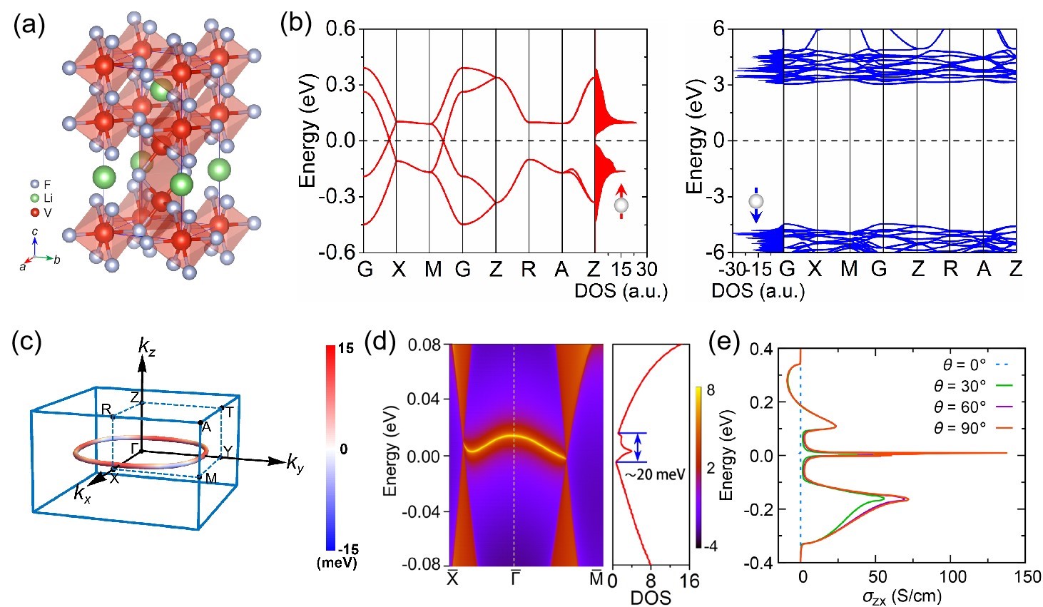 图2: (a)为LiV2F6的晶体结构;图(b)为LiV2F6的自旋极化能带图和态密度图;图(c)为位于kz=0的三维节线轮廓图;图(d)为LiV2F6的[001]面的表面色散和态密度;图(e)为在极角θ = 0°、30°、60°和90°时,本征反常霍尔电导σzx分布图。